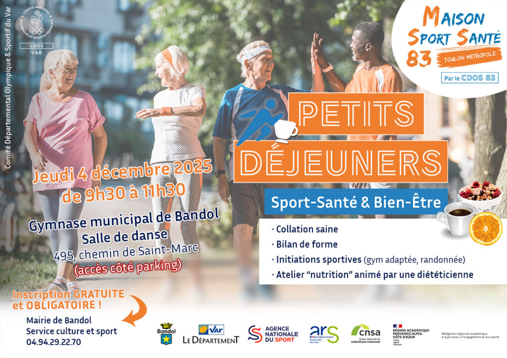 - le jeudi 4 décembre de 9h30 à 11h30 à Bandol, dans la salle de danse du gymnase municipal – bilan de forme, gymnastique adaptée et randonnée au programme ; Inscriptions auprès de la mairie de Bandol au 04.94.29.22.70.