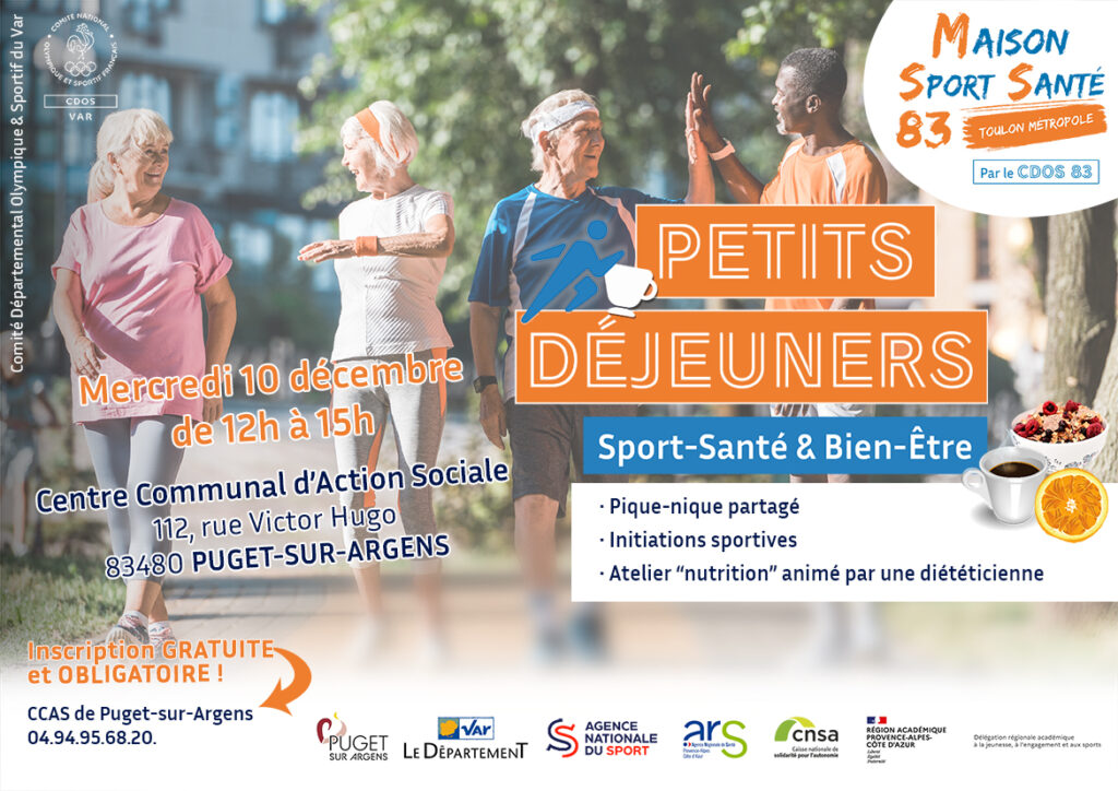 - le mercredi 10 décembre de 12h à 15h à Puget-sur-Argens, au centre communal d’action sociale – pique-nique partagée, initiations sportives et atelier « nutrition » animé par une diététicienne au programme ; Inscriptions auprès du CCAS local au 04.94.95.68.20